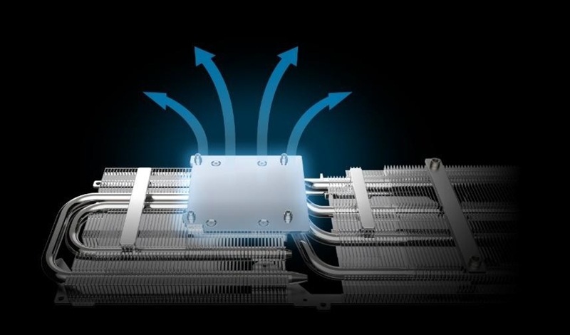 GPUやVRMが発する熱を受け取る銅製の受熱ベースと、ニッケルメッキ処理を施した6mm径×4の銅製ヒートパイプを備え、ヒートシンクへの熱の拡散効率が向上。加えて、垂直フィンと大型ヒートシンクを近接して設置し、熱の拡散を高めるとしている。