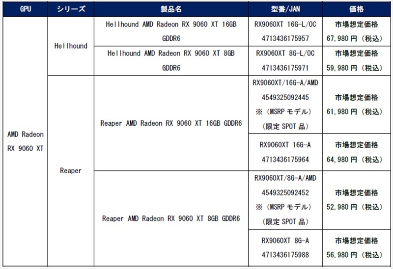 ●Reaper AMD Radeon RX 9060 XT 8GB GDDR6 製品ページ