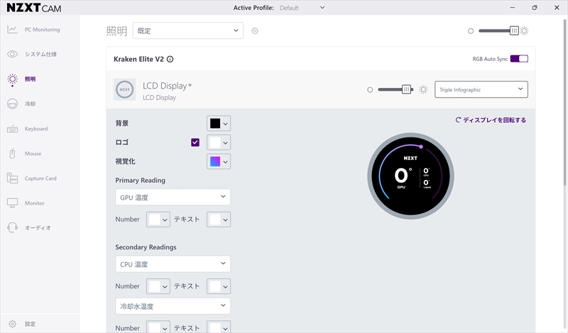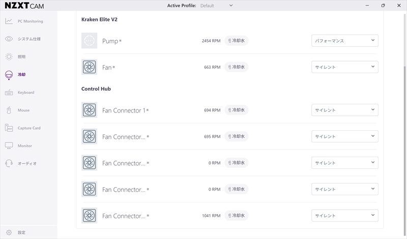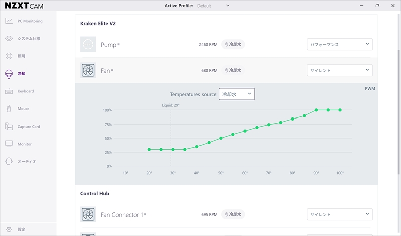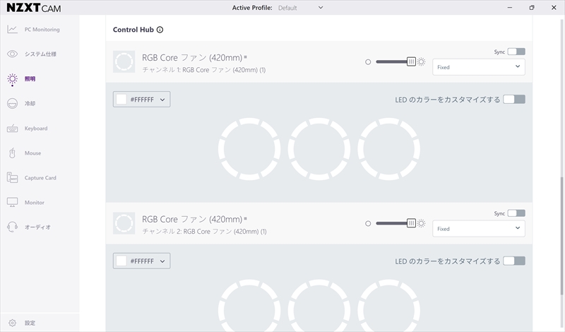 NZXTのファンやオールインワン水冷ユニットなどは、総合ユーティリティ「NZXT CAM」から、LEDライティングの発光色やパターン、ファン回転数の制御などを一括して行えるようになっている。